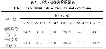 1可見,擬合的電容誤差小于1%。由此可見,在不同的時刻測得UO(t),通過曲線擬合得出參數(shù)RC。再給電路加小信號直流電源,測出R值,即求得C,通過C值則可知被測環(huán)境的壓力。圖5為350℃時,不同的壓力所對應的電容的理論值和實驗值,從實驗數(shù)據(jù)(表2)可得,在測壓的過程中,利用模型識別的方法,誤差較小,其測壓誤差小于2%。