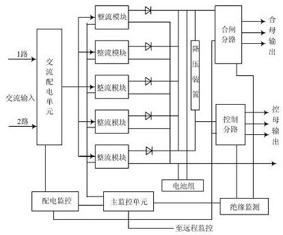 智能高頻開(kāi)關(guān)電源系統(tǒng)的總體結(jié)構(gòu)主要由主監(jiān)控單元、配電模塊、交流配電單元、整流模塊等組成, 系統(tǒng)總體的結(jié)構(gòu)圖如圖1 所示。系統(tǒng)中的各個(gè)監(jiān)控單元受主監(jiān)控單元的管理和控制,通過(guò)通信線將各個(gè)監(jiān)控單元采集的信息送給主監(jiān)控統(tǒng)一管理。主監(jiān)控顯示直流系統(tǒng)各種信息,用戶(hù)也可以觸摸顯示屏查詢(xún)信息及操作,系統(tǒng)信息還可以接入到遠(yuǎn)程監(jiān)控系統(tǒng)中。系統(tǒng)除了交流監(jiān)控、直流監(jiān)控、開(kāi)關(guān)量監(jiān)控等基礎(chǔ)單位外,還配置了絕緣監(jiān)測(cè)、降壓裝置、電池巡檢等功能單元,以達(dá)到對(duì)直流系統(tǒng)進(jìn)行全面監(jiān)控的目的。