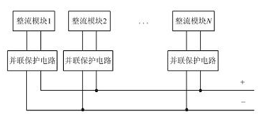 (4) 模塊并聯(lián)保護(hù)。每個(gè)模塊內(nèi)部均有并聯(lián)保護(hù)電路, 可以保證模塊發(fā)生故障時(shí)自動(dòng)退出系統(tǒng),從而不影響其他正常模塊的工作。模塊并聯(lián)輸出示意圖如圖6所示。