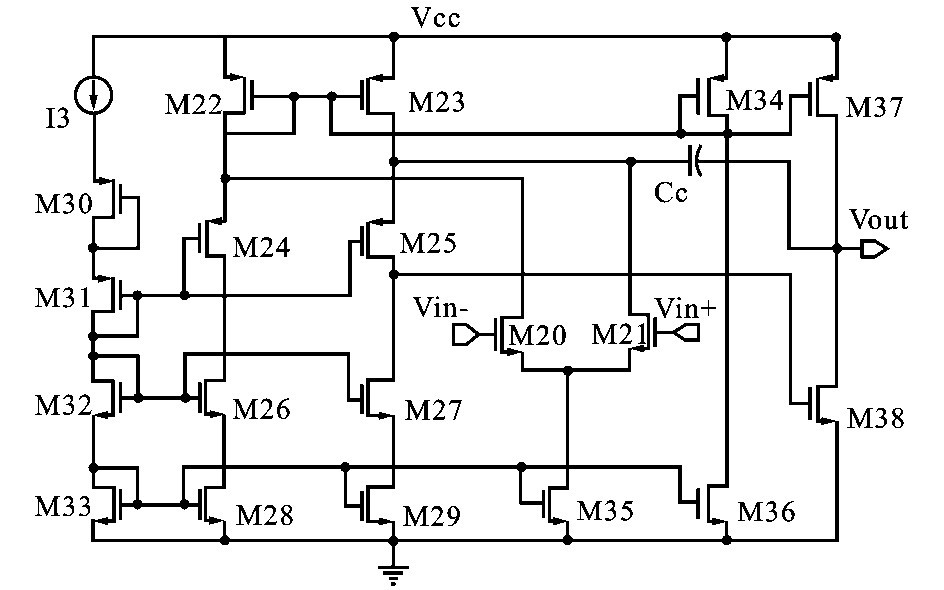 以上分析可知運算放大器起著重要作用,其必須具有較高的增益,才能使A 點電壓精確跟隨參考電壓,從而準確設定B 點電平和滯環(huán)電壓大小。 另外由于V out的變化頻率與系統(tǒng)開關頻率相同(系統(tǒng)的最大開關頻率約為2MHz) ,使得流過M1 的電流也相同頻率在IM1和I′M1之間快速切換,所以運放的單位增益帶寬須大于系統(tǒng)的最大開關頻率。 設計的運放結構如圖4 所示,采用折疊式輸入結構,可以獲得較大的共模輸入電壓范圍。