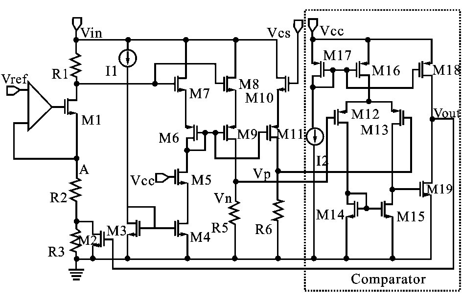 4. 5V~28V 的輸入電壓經調整轉換為5V 的恒定電壓Vcc 為后續(xù)電路供電。 如圖3 所示,A 點電位受運算放大器鉗制,將等于參考電壓1. 2V ,假設輸出V out 為高電平,則M2 導通,流過M1 的電流為IM1 = V ref / R2 ,B 點的電壓為V BL = V in - IM1 R1 ;當V out為低電平,M2 截止,流過M1 的電流變?yōu)镮′M1= V ref / ( R2 + R3 ) ,B 點電壓升高為V BH = V in -I′M1 R1 ,所以B 點電壓的變化為ΔV B = V BH - V BL= V ref R1 R3/ R2 ( R2 + R3) ,這意味著V out由高電平變成低電平時在B 點產生的一個滯環(huán)電壓,可見該滯環(huán)電壓與輸入電壓無關,只由參考電壓V ref和電阻大小決定,通過選擇各電阻的阻值便可設定滯環(huán)電壓的大小。