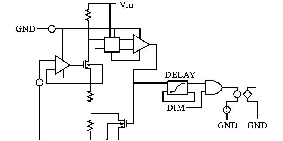 滯流控制模塊應用如圖1 所示,L ED 驅動電流的變化反應在檢測電阻RSENSE兩端的壓差變化上。 本設計中,檢測電阻設為0. 5Ω ,較小的檢測電阻有利于降低功耗和保持較高的轉換效率。 滯環(huán)電流控制模塊內部自建兩個電壓閾值,檢測電壓Vcs與閾值電壓進行比較,比較結果和DIM 調光信號相與來控制功率開關管的通斷。