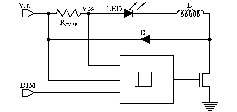 滯流控制模塊內部電路如圖2 所示,當DIM 信號為高電平期間,當Vcs 大于上電壓閾值時,控制電路輸出低電平,關閉功率開關管。 由LED、電感L 、續(xù)流二極管D 和RSENSE組成的回路使得電感繼續(xù)為L ED 提供電流,電感電流逐漸減小,使得檢測電壓Vcs 隨之減??;當Vcs 小于下閾值電壓時,控制電路輸出高電平,導通功率開關管,此時D 截止,形成從電源經RSENSE、L ED、L 和功率開關管到地的回路,電源為電感L 充電,電感電流上升,檢測電壓Vcs隨之升高。 Vcs 大于上電壓閾值時,控制電路關斷開關管,重復上個周期的動作,這樣就完成了對L ED驅動電流的滯環(huán)電流控制,使得流過L ED 的驅動電流,也就是電感電流的平均值恒定。