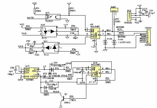 圖2的下半部分為本文的重點(diǎn)部分,完成RS-232與RS-485標(biāo)準(zhǔn)之間的無源轉(zhuǎn)換。該部分的核心為Maxim公司的負(fù)電源轉(zhuǎn)換芯片ICL7662。電路的工作電源來自于RS-232的發(fā)送信號(hào)線PTXD,由電荷泵ICL7662進(jìn)行正負(fù)電源轉(zhuǎn)換,能量存儲(chǔ)于儲(chǔ)能電容C1、C2、C3中,作為本部分電路的工作電源。根據(jù)EIA的標(biāo)準(zhǔn),RS-232在發(fā)送數(shù)據(jù)時(shí),發(fā)送端驅(qū)動(dòng)器輸出正電平在 5V~ 15V(邏輯0),負(fù)電平在-5V~-15V(邏輯1),接收器的典型電平在 3~ 12V與-3~-12V(見參考文獻(xiàn)[1])之間,RS-485的接收門限為 /-200mv(見參考文獻(xiàn)[2])。由MAX487完成RS-232與RS-485標(biāo)準(zhǔn)之間的轉(zhuǎn)換,電路自動(dòng)完成收發(fā)控制的轉(zhuǎn)換。本部分對(duì)控制內(nèi)核來講處于無源工作狀態(tài)下,不受所在終端工作狀態(tài)的影響,自動(dòng)完成收、發(fā)狀態(tài)控制,避免網(wǎng)絡(luò)“死鎖”。當(dāng)電路所在的節(jié)點(diǎn)不接RS-232時(shí),本部分電路不工作,使得系統(tǒng)的功耗最小。當(dāng)節(jié)點(diǎn)通過RS-232與系統(tǒng)通信時(shí),監(jiān)控系統(tǒng)的數(shù)據(jù)首先轉(zhuǎn)換到RS-485網(wǎng)上,節(jié)點(diǎn)數(shù)據(jù)先經(jīng)過本節(jié)點(diǎn)轉(zhuǎn)換電路轉(zhuǎn)換到RS-232的電平狀態(tài),然后與監(jiān)控系統(tǒng)通信。