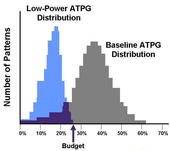 然而,如果我們采用相關技術降低測試期間的功耗,我們就能有效地將這種分布向左移。在圖1中重疊的藍色低功率分布區(qū),掃描ATPG向量的峰值開關活動沒有超過功率預算,因此降低了制造測試中功率問題產生的風險。