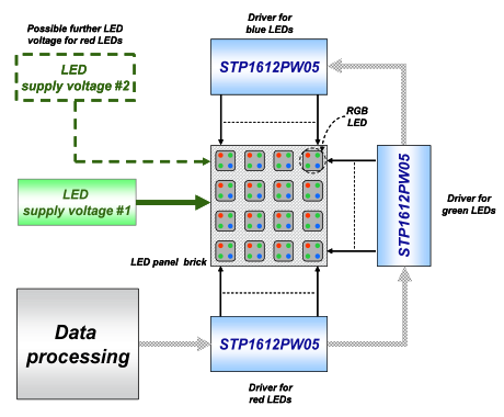 圖 3:通過STP1612PW05驅(qū)動一個全彩LED顯示屏點陣的設計簡圖