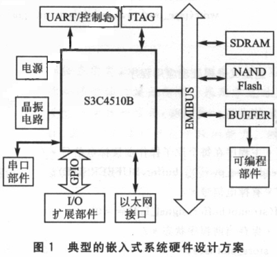 圖1是一種典型的嵌入式系統(tǒng)硬件設計方案。系統(tǒng)的微處理器采用S3c4510B,是基于ARM7體系結構的。SDRAM是一種易失性存儲器作為程序的運行空間,類似于PC機的內存;Flash作為程序存儲空間是非易失性的。程序運行過程中的數據往往緩存在sDRAM中,在系統(tǒng)失電時必須寫往Flash。