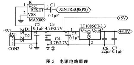 這個電源回路除了可以提供5v和3.3v的電源以外,還為系統(tǒng)掉電保護提供了延時及預警功能,通過軟件的配合可以實現系統(tǒng)的掉電保護機制。正常情況下,由供電回路1給整個系統(tǒng)供電。當系統(tǒng)由于意外原因掉電時,由于輸入的比較電壓降低,這樣MAX809 模塊輸出電壓產生翻轉為系統(tǒng)提供掉電中斷預警信號,中斷請求通過外部中斷引腳XREQ0產生;同時供電回路2開始啟用。通過大電容C3、c4放電,繼續(xù)為系統(tǒng)提供一段供電電壓,支持掉電中斷服務程序完成。供電回路2只給最小系統(tǒng)供電,并不給耗電量大的外圍部件供電。這樣,給最小系統(tǒng)的供電時間足夠長,可以完成敏感數據的保護操作。