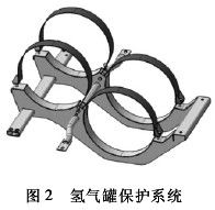 ( 2) 氫氣罐保護(hù)。高壓氫氣罐的固定支架和鋼帶應(yīng)有足夠的強(qiáng)度,以保證在碰撞過程中,高壓氫氣罐的動(dòng)態(tài)位移不會(huì)太大,避免造成連接管路的斷裂、變形和氫氣的大量泄漏。何?。?3]基于顯式有限元理論,按照 CMVDR294 法規(guī)對(duì)國內(nèi)自主開發(fā)的某燃料電池轎車進(jìn)行正面碰撞分析,對(duì)比分析兩種氫氣罐保護(hù)系統(tǒng)設(shè)計(jì)方案的計(jì)算結(jié)果,提出了安全有效的氫氣罐保護(hù)方案,即氫氣罐保護(hù)系統(tǒng)采用整體式設(shè)計(jì)。如圖 2 所示,氫氣罐框架通過 3 根橫梁和 2 根縱梁將兩個(gè)氫氣罐集成到一個(gè)框架總成??v梁截面為“Π”形,由幾塊板材拼焊而成,中部設(shè)計(jì)出兩個(gè)圓弧形凹槽,可以對(duì)氫氣罐進(jìn)行有效的固定和保護(hù)。