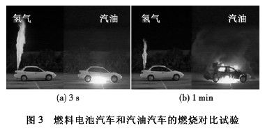 邁阿密大學(xué)的 MICHAEL[15]分別對(duì)燃料電池汽車和汽油汽車的燃燒進(jìn)行對(duì)比試驗(yàn),將兩輛汽車分別用氫氣和汽油做燃料,然后做泄漏點(diǎn)火試驗(yàn),如圖 3 所示。點(diǎn)火 3 s 后,高壓氫氣產(chǎn)生的火焰直噴上方,而汽油由于比空氣重,則從汽車的下部著火。到 1 min 時(shí),氫氣作燃料的汽車只有漏出的氫氣在燃燒,汽車沒有大問題; 而汽油車則早已成為一個(gè)大火球,完全燒光。這說明氫氣汽車比現(xiàn)在普遍使用的汽油車安全得多。