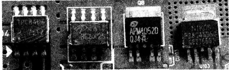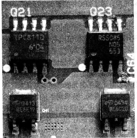背光燈驅動板主要由振蕩器、調制器、功率輸出電路及保護檢測電路組成,如1圖所示。在實際電路中,除功率輸出部分和檢測保護部分外,振蕩器、調制器及控制部分通常由一塊單片集成電路完成,這類集成電路常用的主要有BD(Rohm公司生產,如BD9884FV、BD9766等)及OZ系列(凹凸微電子公司生產,如02960、02964等);功率輸出管多采用互補的功率型場效應管,有的采用3腳和8腳(①~③腳為S極,④腳為G極,⑤-⑧腳為D極)貼片封裝型,常見型號有D454、RSS085、D413、TPC8110、FDD6635.FDD6637等,如圖2所示;還有的采用由N溝道和P溝道組合的5腳或8腳MOSFET功率塊(①腳為Sl極,②腳為Gl極,③腳為S2極,④腳為G2極,⑤~⑧腳為D1、D2極),如SP8M3、TPC8406、4614、APM40520、P2804ND5G等,如圖3所示。保護檢測多由集成電路10393、358、393或LM324及其外圍元件來完成。輸出電路主要由高壓變壓器、諧振電容及背光燈管組成,并設有輸出電壓、輸出電流取樣電路?!?/p>