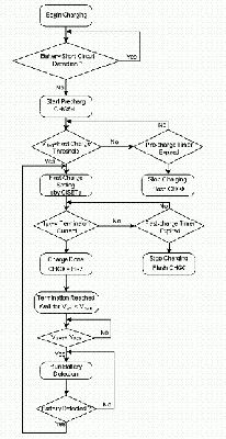 圖6所示為鋰離子電池充電器的標(biāo)準(zhǔn)充電流程,首先充電IC偵測(cè)是否有輸出短路或是過(guò)載的保護(hù)模式,若系統(tǒng)一切正常接著偵測(cè)電池初始電壓是否達(dá)到 3V以上,高于3V者就直接以快充模式進(jìn)行高電流充電,若電池低于3V者,進(jìn)入預(yù)充電模式,以快充的10%進(jìn)行充電,喚醒電池并避免電池?fù)p壞。在預(yù)充電階段,仍隨時(shí)偵測(cè)電池電壓,達(dá)到3V后可隨即切入快充模式。