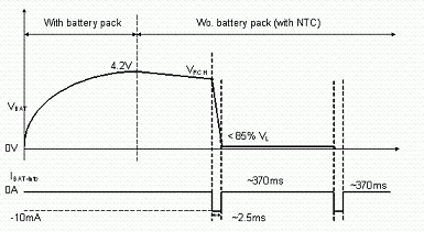 使用者亦有可能在充電或式充電完畢后,在未將電源移除的情況下,即抽離電池的情況。為避免造成危險(xiǎn),IC內(nèi)部應(yīng)具有如圖7, 8的電池存在偵測(cè)機(jī)制。充電IC會(huì)以短時(shí)間脈沖(每370ms產(chǎn)生2ms的脈沖)方式抽取電池電流,此時(shí)若電池存在,則偵測(cè)到的電池電壓應(yīng)大于一預(yù)設(shè)閥值;若電池已切離,則充電IC偵測(cè)到一低電壓,即可判定為電池?cái)嚅_(kāi)狀態(tài),并將電池端電壓切斷,保護(hù)使用者安全。