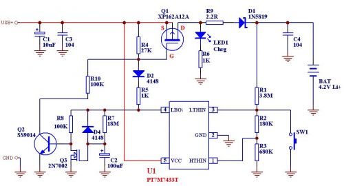 其工作流程大致是:當(dāng)接上Li+電池和供電電源時(shí),IC通過R1/R2/R3組成的網(wǎng)絡(luò)檢測電池電壓,如果電池電壓低于3.3V(由R1-R3的電阻值決定),或者按下按制SW1,此時(shí)IC3腳的電壓低于615mV,則IC4腳輸出低電平,通過R5/D2拉低Q1的柵極使之導(dǎo)通,從而通過Q1/R9/D1給電池進(jìn)行大電流充電,當(dāng)電池電壓一路上升直至超過4.20V,此時(shí)IC的1腳電壓高過615mV,IC內(nèi)部經(jīng)簡單判斷和延時(shí),令4腳輸出高電平,從而關(guān)閉大電流充電通道,但是4腳的高電平同時(shí)給R7/C2的充電回路供電,令到Q3的柵極電壓慢慢升高,并給R8提供通路導(dǎo)致Q2導(dǎo)通,通過R10給Q1提供一個(gè)較弱的導(dǎo)通電流,使之微微導(dǎo)通,從而為電池提供一個(gè)較少的補(bǔ)充充電電流。按照圖中所示元件參數(shù)將于大約十分鐘后,由于C2的不斷充電,其端電壓即Q3的柵極電壓不斷上升直至使Q3導(dǎo)通,從而關(guān)閉Q2,令到整個(gè)充電過程結(jié)束。