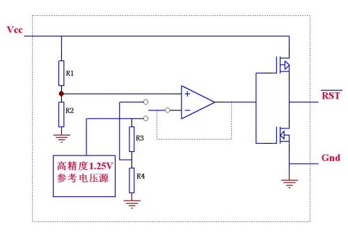 IC內(nèi)含一個(gè)高精度的615mV基準(zhǔn)電壓源、兩個(gè)比較器、一個(gè)RS觸發(fā)器和其它一些邏輯電路,其大致功能是:VCC電壓或其它待檢測電壓通過R1-R3組成的分壓網(wǎng)絡(luò)接在IC的LTHIN /HTHIN檢測引腳,當(dāng)待測電壓下降導(dǎo)致LTHIN引腳低于615mV時(shí),輸出腳LBO輸出低電平,而如果待測電壓上升導(dǎo)致HTHIN引腳高于615 mV時(shí),經(jīng)過內(nèi)部邏輯判斷和簡單延時(shí)后,輸出腳LBO輸出高電平。