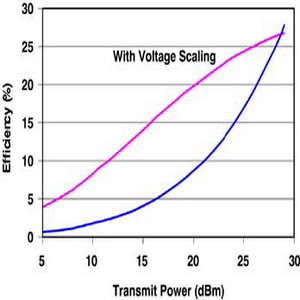 動(dòng)態(tài)/可適性電壓調(diào)整技術(shù)(DVS/AVS)與高整合度組件所使用的方式很類似,它會(huì)把閉回路系統(tǒng)中的處理器和穩(wěn)壓器連結(jié)在一起,并在確保系統(tǒng)正常工作的情形下,將數(shù)字電源供應(yīng)的輸出電壓動(dòng)態(tài)調(diào)整至最小值。功率放大器會(huì)被最佳化,使它在最大傳送功率下?lián)碛凶罡咝?。由于絕大多數(shù)手機(jī)都在基地臺(tái)附近工作,手機(jī)的無(wú)線電功能會(huì)在維持通訊質(zhì)量的前題下,將傳送功率降至最低水平。當(dāng)功率放大器在較低的功率水平下工作時(shí),它的效率會(huì)受到影響,從(圖三)可以看出,利用動(dòng)態(tài)電壓調(diào)整技術(shù)來(lái)調(diào)整功率放大器的電壓,它的工作效率會(huì)增加10%至20%。