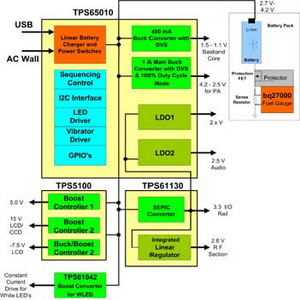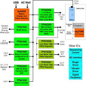 在這個(gè)解決方案中,就算鋰離子電池下降至3.3V 左右,在100%負(fù)載周期模式下工作的高效率TPS62200降壓轉(zhuǎn)換器仍能提供3.3V 的I/O電壓。上述所有零件都采用SOT-23 封裝,除了bq24020 電池充電組件、TPS61020 升壓轉(zhuǎn)換器以及TPS61042 白光二極管驅(qū)動(dòng)組件之外,它們是采用3×3 平方厘米的QFN 封裝。TPS61040 和TPS61042 還內(nèi)建上端FET 晶體管,每顆組件只需要一個(gè)外接二極管。bq24020、TPS622xx、TPS61020 和線性穩(wěn)壓器組件全都內(nèi)建FET 晶體管,功率放大器和中央處理器電源采用的動(dòng)態(tài)電壓調(diào)整技術(shù)可以提高每顆零件的效率,進(jìn)而協(xié)助降低功耗。