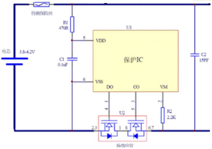 保護IC失效電路示意圖如圖2所示,此時保護IC對短路不能起到保護作用,當(dāng)負(fù)載出現(xiàn)短路時候需要保險絲快速熔斷。