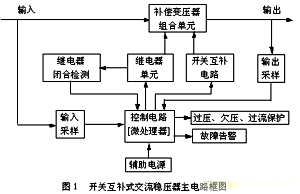 本穩(wěn)壓器由補償變壓器組合單元、繼電器單元、開關互補電路、控制電路、過欠壓以及過流保護及故障告警電路、輔助電源等部分組成,整機框圖如下: