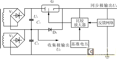 輸入400Hz/220V電源,經(jīng)高壓變壓器升壓變換后,輸出兩路交流高壓分別送入兩組整流器及濾波器,其中一組作為收集極電壓(Uc=15~18kV,Ic=85mA,而不需要專門做收集極高壓,這是該電路的獨特之處)送入行波管收集極。另外,將整流濾波后的兩組直流電壓串聯(lián),經(jīng)調(diào)整管G穩(wěn)壓后輸出穩(wěn)定度很高的直流電壓(UA=20~25kV,Ia≥15mA,穩(wěn)壓可調(diào))給行波管的同步極。在調(diào)整管G的陰極和兩整流器串聯(lián)點之間接一個高壓硅柱D3,對調(diào)整管G構(gòu)成過壓保護電路,調(diào)整管G出現(xiàn)的最高電壓就是整流器V1空載時的輸出電壓。所以調(diào)整管G可以選耐壓很低的管子。同時濾波電容C1、C2的耐壓也相應(yīng)降低了,因而大大減小了體積和重量。特別是消除了兩組電壓因充放電不一致引起高壓差而打火。