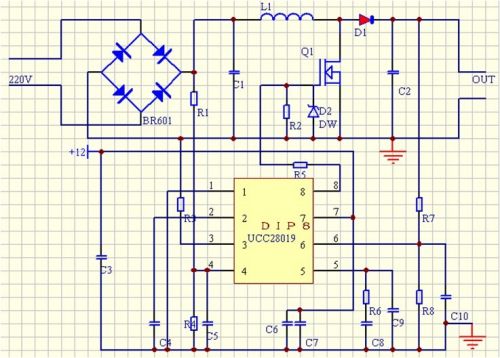芯片選擇:TI公司的UCC28019可控制功率輸出為100W-2KW,功率因數(shù)可提高到0.95,符合設(shè)計要求,故此次設(shè)計選用該款芯片;
