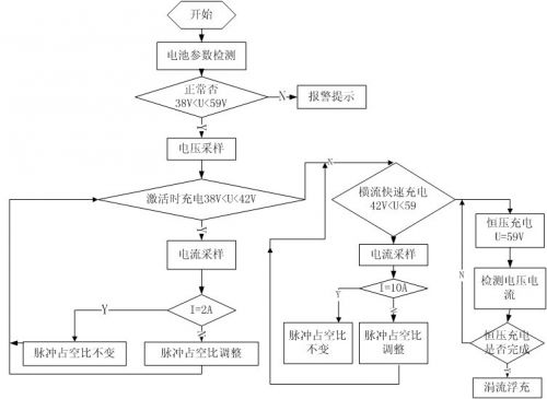 激活充電:充電器開始工作后單片機(jī)采集采集蓄電池端電壓檢測,若電壓過低說明曾過度放電,為避免充電電流過大,實行小電流激活。
