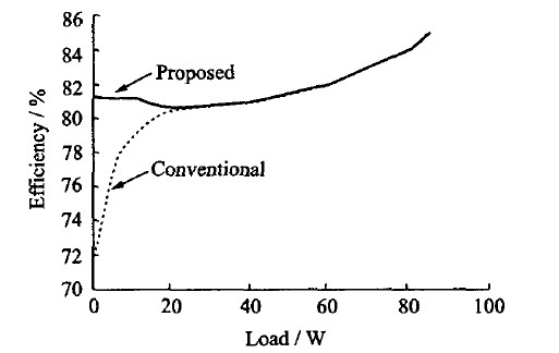 圖14給出了集成了該低功耗電源系統(tǒng)的綠色多模式反激式控制器的效率圖(工作頻率為40~130kHz),并與傳統(tǒng)的反激變換器效率進(jìn)行了比較。由圖可知,采用多模式反激式控制降低了芯片的輕載功耗,提高了效率。