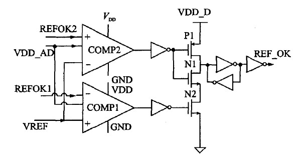 此外,本設(shè)計(jì)中還設(shè)置了一個(gè)REF-OK模塊來(lái)判斷上電后電源系統(tǒng)是否已進(jìn)入正常工作狀態(tài)。