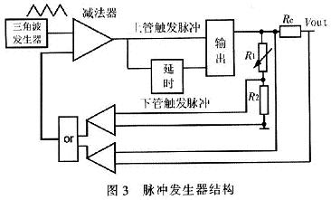 系統(tǒng)采用了電流負反饋電路,以適應激光二極管的要求。當負載變化,電流略大于給定電流時,減小ton寬度,電壓降低。電流略小于給定電流時,增加ton寬度,這樣可以維持電流穩(wěn)定。圖3所示為脈沖發(fā)生器結(jié)構(gòu)。