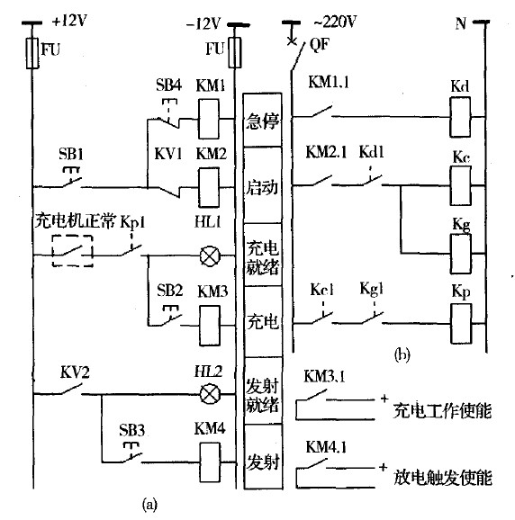 圖3(a)中,KM1-4為SSR,SB1-4為自鎖按鈕。系統(tǒng)上電后,通過按鈕SB1啟動KM1和KM2,這樣Kd將首先得電動作,隨后Kc、Kg、Kp也相繼動作,為下一步進(jìn)行的充電工作做好了準(zhǔn)備。圖3(b)中,Kc和Kg啟動采用了位置接點(diǎn)Kdl,同樣Kp啟動也采用了位置接點(diǎn)Kcl和Kgl,這樣設(shè)計目的是使控制電路具有了邏輯動作與防誤閉鎖功能。此時只要充電設(shè)備自檢正常(圖3(a)中"充電機(jī)正常"接點(diǎn)閉合),則燈HI 1指示可以進(jìn)行充電,通過按鈕SB2啟動KM3便可對脈沖電容器組進(jìn)行充電。脈沖電容器電壓達(dá)到預(yù)設(shè)值后,KV動作,常閉接點(diǎn)KV1斷開致使KM2失電,則Kc、Kg、Kp相繼返回,同時Kp返回又使KM3失電,這樣Kc、Kg斷開,充電機(jī)停止工作,滿足了系統(tǒng)放電前提。此時燈HL1熄滅、KV2接通,燈HL2指示充電完畢,通過按鈕SB3啟動KM4則可進(jìn)行ETCG發(fā)射。