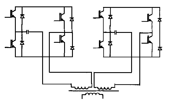 當(dāng)負(fù)載電容容量小且重復(fù)頻率高時, 一種設(shè)計思想是改進(jìn)控制電路, 使其達(dá)到的效果相當(dāng)于: 在每一個充電周期開始階段, 使用諧振電流大的主電源快速充電至預(yù)設(shè)電壓, 隨后轉(zhuǎn)為小電流電源充電, 在T w 階段向負(fù)載提供很小的電量以減小波動; 另一種技術(shù)路線采用雙橋路的移相控制電路, 如圖7 所示,這種電路非常適合大功率充電的應(yīng)用場合。EM I 公司的30kJ/s , 50kV 電源采用了此項技術(shù)。