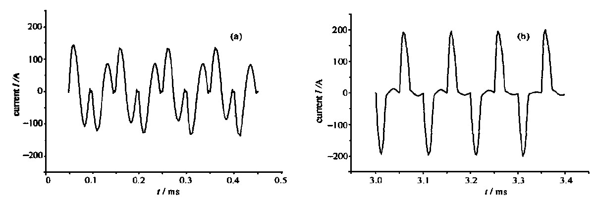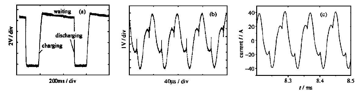 圖6 是某調(diào)制器充電電源波形圖, 該電源充電功率可達(dá)2kJ/s , 工作頻率12. 5kHz, 電壓30kV.測量用的示波器型號為泰克TDS3032.V s= 500V , C r= 0. 4uF,L r= 158uH, T s= 80us, 變壓器副邊為雙繞組,每繞組升壓比1∶40, Cload= 0. 66uF.實際電路中L r 完全利用了變壓器的漏感, 且漏感選擇較大以減小分布電容。圖6 (c) 是該電源諧振開關(guān)電流的仿真波形, 和實測波形比, 吻合得很好。