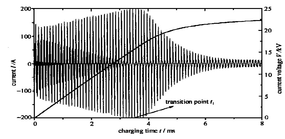 忽略回路電阻, 電路的特征阻抗為Z =√ L/C , 諧振周期為T r = 2π √L/C , 其中C 是諧振電容C r 和折合到原邊的負(fù)載等效電容C''串聯(lián)后形成的總電容, 通常因高壓變壓器變比高, 等效電容C ''和C r相比較大, 因此串聯(lián)后的總電容C 和C r 相差不大。完整的充電電流波形包絡(luò)及充電電壓如圖4 所示, 其中t1是轉(zhuǎn)折點, t1 以前是線性等臺階充電, t1 以前電流波形放大如圖5 (a) 所示, 轉(zhuǎn)折點附近的電流波形如圖5(b) 所示。