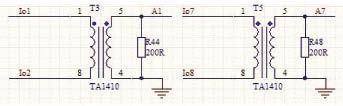 此系統(tǒng)輸出電流小于1A,故選擇最大可以測量1A的電壓型電流互感器TA1410,負載電阻用是200歐,輸出電壓為-1V~1V的交流電壓。電路如圖4所示。