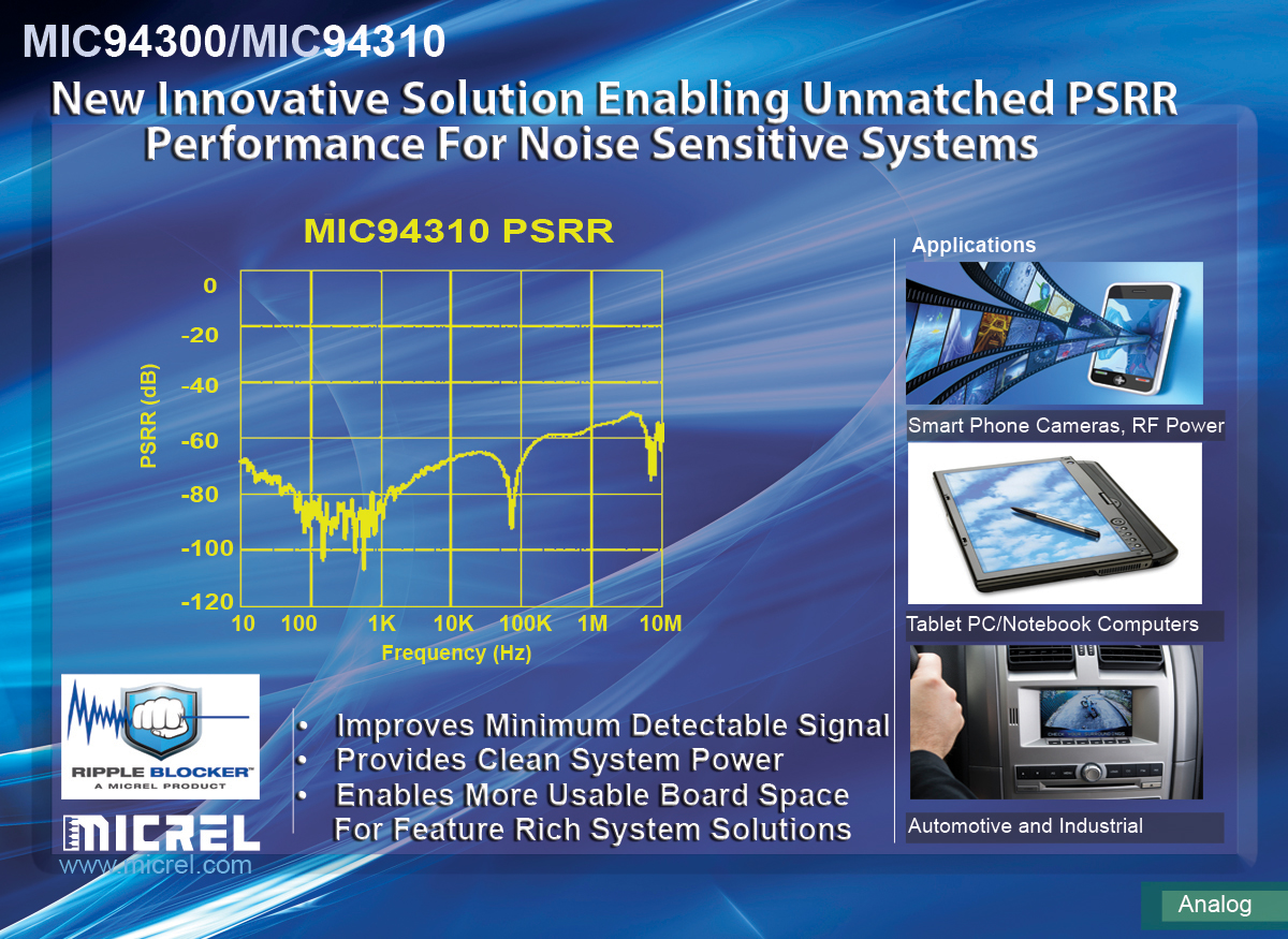 模擬、高帶寬通信及以太網(wǎng)集成電路(IC)解決方案領(lǐng)域的行業(yè)領(lǐng)導(dǎo)者麥瑞半導(dǎo)體(Micrel Inc.)近日發(fā)布了Ripple Blocker系列IC,包括MIC94300電壓跟隨輸出IC和MIC94310固定輸出(LDO)IC。
