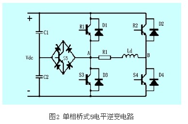 對(duì)圖1進(jìn)行改進(jìn)就可以得到5電平單相橋式逆變電路,如圖2所示。和圖1相比,多了一個(gè)電容,使負(fù)載輸出的電平數(shù)為5:vdc,-vdc,0,+vdc/2,-vdc/2。s5截止時(shí)其工作同單相全橋逆變電路,可輸出三電平;s5和s4(d4)導(dǎo)通時(shí),uab=vdc/2; s5和s2(d2)導(dǎo)通時(shí),uab=-vdc/2。