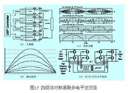 有些學(xué)者為非對(duì)稱混聯(lián)多電平逆變電路提出了主從逆變單元的概念。主逆變單元(master)就是串聯(lián)連接的逆變器中,直流電壓最高的單元,它承擔(dān)級(jí)聯(lián)逆變器大多數(shù)的功率,通常由gto、igct完成,同時(shí)通過(guò)dc/dc雙向功率電源向從逆變單元(slave)供電。其它的逆變單元稱為從逆變單元,直流電壓較低,只負(fù)責(zé)完成自己的逆變?nèi)蝿?wù)。圖17所示為(a)(b)(c)(d)分別為4級(jí)連接81電平的逆變器主電路、輸出波形、功率分配情況及dc/dc雙向功率電源。