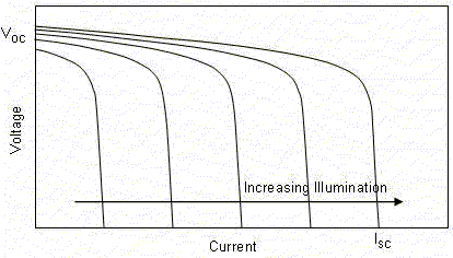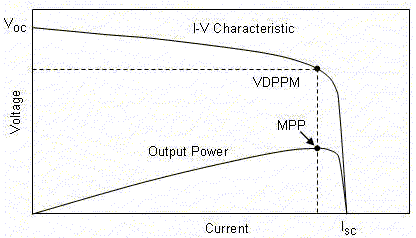 在大多數應用中,人們期望從太陽能電池獲取盡可能多的功率。因為輸出功率是輸出電壓和電流的乘積,有必要確定電池的哪一部分的工作區(qū)域產生的輸出電壓和電流的乘積的數值最大,這一點被稱為最大功率點(MPP)。在一種極端情況下,輸出電壓為其最大數值(VOC),但是,輸出電流為零;在其它極端情況下,輸出電流位其最大值(ISC),但是,輸出電壓為零。在兩種情況下,輸出電壓和電流的乘積都是零。因此,MPP必須位于兩種極端情況之間的某處。