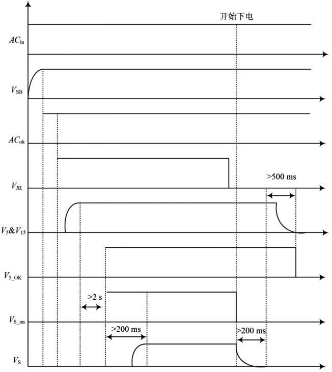 PDP電源在工作時(shí),具有嚴(yán)格的開機(jī)時(shí)序和關(guān)機(jī)時(shí)序。當(dāng)插上整機(jī)電源插頭后,輸出待機(jī)電源VSB,同時(shí)交流信號(hào)檢測ACOK=1.此時(shí)按下開關(guān)。數(shù)字電路CPU向電源發(fā)出電源控制信號(hào),使VRL =1,電源向各種邏輯電路、控制電路、保護(hù)電路提供+5V,+15V電源,然后將V5_ok置1.當(dāng)電源檢測信號(hào)V5_ok=1時(shí),數(shù)字電路CPU向電源發(fā)出VS_on=1.PDP電源向顯示系統(tǒng)提供180V高壓。關(guān)機(jī)時(shí),先關(guān)掉高壓電源,然后再關(guān)掉+5 V,+15 V 電壓。工作時(shí)序如圖2所示。