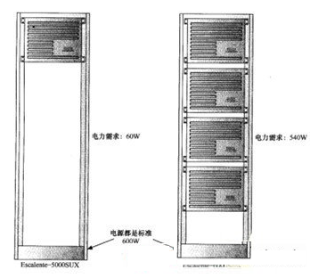 以圖所示的服務(wù)器為例,兩個(gè)服務(wù)器來(lái)自同一個(gè)系列WasteTech""sEscalenteline。左邊的WasteTech""sEscalente5000SUX配置了足夠的硬件,只需要60W的電能。右邊的6000SUX的最高配置安裝上足夠多的硬件后則要消耗540W的電能。然而兩臺(tái)服務(wù)器卻使用了同樣的電源。盡管目前的電源使6000SUX獲得了足夠的電能,但是對(duì)于消耗電量較少的服務(wù)器而言,則提供了過(guò)多的電能。這種過(guò)度供電造成了浪費(fèi)。