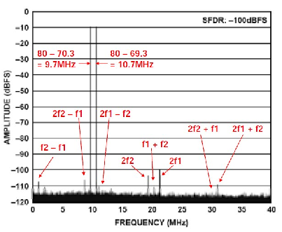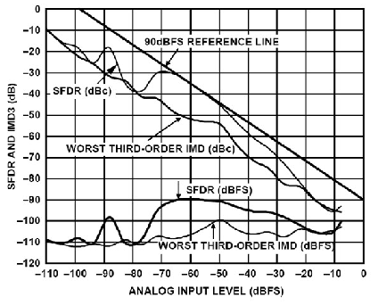 因此,混疊音出現(xiàn)在9.7 MHz和10.7 MHz,位于第一奈奎斯特區(qū)。圖4同時(shí)顯示了所有混疊IMD積的位置。高SFDR會(huì)增強(qiáng)接收器在有大信號(hào)時(shí)捕獲小信號(hào)的能力,并防止小信號(hào)被大信號(hào)的交調(diào)積掩蓋。圖5所示為AD9444雙音SFDR(為輸入信號(hào)幅度的函數(shù)),其中,兩個(gè)音的輸入頻率相同。