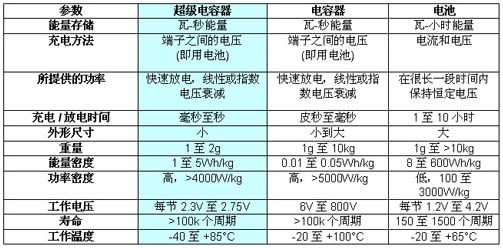 表 1:超級(jí)電容器、電容器和電池的比較