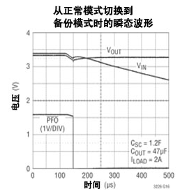 圖 3:LTC3226 從正常模式切換到備份模式時(shí)的瞬態(tài)波形