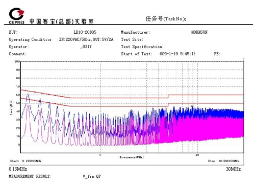 5. 具有較低的EMI性能。EN55011有l(wèi)evel B,level A兩個等級,level B比level A嚴苛得多。圖2、圖3是LD10產(chǎn)品的EMI測試數(shù)據(jù),該數(shù)據(jù)由國家電子五所專業(yè)測試。測試結果可以看出,該系列電源具有較低的電磁輻射性能,達到EN55011,level B的要求。