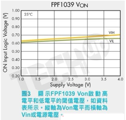 資料表中的規(guī)格增加了針對製程、電壓和溫度變化的緩衝,表明Von必須超過1.0V來開啟開關(guān),并且必須低于0.4V來關(guān)閉開關(guān)。這帶來了非常簡單的驅(qū)動電路,可以直接連接至微處理器。此Von規(guī)格隨元件而不同且可能不一定會如圖3那樣平坦。不要停留在資料表中顯示靜態(tài)閾值電平的那一行;可以參照曲線來瞭解全部詳情。