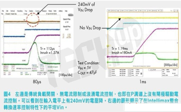 我們應(yīng)該更進(jìn)一步鉆研的下一代智慧型FET的特性是當(dāng)開關(guān)關(guān)閉時(shí)會發(fā)生什么?採用離散P溝道的傳統(tǒng)負(fù)載開關(guān)可以完全關(guān)閉并連接輸入至輸出,不管是重負(fù)載還是大電容載入在輸出腳上。如果這種情況發(fā)生,通常初級端輸入電平會顯示電壓突降,它可能影響與偏置電平相關(guān)聯(lián)的精密類比數(shù)位轉(zhuǎn)換器(ADC)或感測器。在過去,電阻/電容(R/C)網(wǎng)路添加至閘極以降低開啟速度,但這會增加專案的設(shè)計(jì)時(shí)間和規(guī)模。Intellimax支援轉(zhuǎn)換速率控制特性,藉著在輸入端限制浪涌電流,可使電平中斷最小化。圖4顯示了此方案在實(shí)證研究的實(shí)驗(yàn)室測試中的一個(gè)例證。注意,左邊為採用傳統(tǒng)P溝道方法對Vin電平的影響,右邊的則是Intellimax器件的影響。