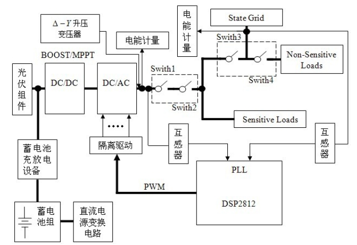 微網(wǎng)逆變器系統(tǒng)將可再生能源(如太陽能,風(fēng)能,水能,地?zé)崮埽镔|(zhì)能等)轉(zhuǎn)變?yōu)榕c電網(wǎng)同頻、同相的交流電,優(yōu)先輸送給當(dāng)?shù)刎摵晒╇?,剩余的電能饋入電網(wǎng)。微網(wǎng)逆變器系統(tǒng)主要包括:光伏組件,蓄電池組,蓄電池充放電設(shè)備,DC/DC 變換器,微網(wǎng)逆變器,靜態(tài)開關(guān)等。
