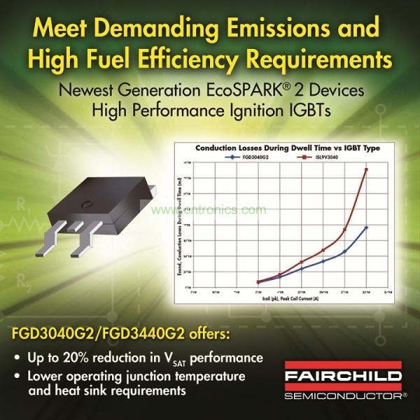 為了滿足現(xiàn)今和新興點火系統(tǒng)對排放和高燃油效率的嚴苛要求,汽車設計人員需要更高性能的點火線圈驅動器技術。為幫助設計人員滿足這些要求,飛兆半導體公司推出了在較小的占位面積下具有更低功耗的最新一代點火IGBT器件。EcoSPARK2、FGD3040G2和FDG3440G2點火線圈驅動器可將VSAT降低多達20%,而不會顯著降低自箝位感性負載開關(Self Clamping Inductive Switching, SCIS) 的能量。這項優(yōu)化特性減低了功耗和工作結溫,并降低了對散熱器的要求。