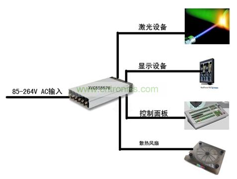 設(shè)備總功率約為1,100W,滿足醫(yī)療設(shè)備認(rèn)證,需要四組不同直流輸出,首先是大電流的48V、20A用于激光設(shè)備, 其次需要一個18V用于LCD顯示器,再次需要一個5V用于控制面板,最后還需要一個12V用于系統(tǒng)散熱風(fēng)扇。這個客戶找了很多品牌的產(chǎn)品都無法定型,因為電源系統(tǒng)太復(fù)雜,價格太高,占用的空間太大,最后他選擇了Excelsys,在40.5×260×127mm(1U高)的封裝內(nèi)解決了問題。