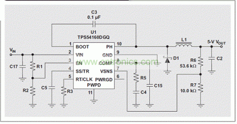 為了說明使用高開關(guān)頻率的權(quán)衡過程,我們設(shè)計了三個獨立電源,其工作頻率分別為100、300和750 kHz。所有這三種設(shè)計,輸入電壓均為48V,輸出電壓均為5V,而輸出電流均為1A。這些要求常用于為一個5-V邏輯USB,或者為其它DC/DC轉(zhuǎn)換器使用的中頻通用5-V總線供電,例如:低壓降穩(wěn)壓器等。若想建立一些設(shè)計限制,所選允許紋波電壓需為50mV,其約為輸出電壓的1%;同時選擇使用0.5 A的峰至峰電感電流。德州儀器TPS54160是一種集成MOSFET的2.5-MHz、60-V、1.5-A降壓DC/DC轉(zhuǎn)換器,用作所有設(shè)計的穩(wěn)壓器。TPS54160特有外部補(bǔ)償和快速可編程頻率,適用于一些高輸入電壓的工業(yè)應(yīng)用。